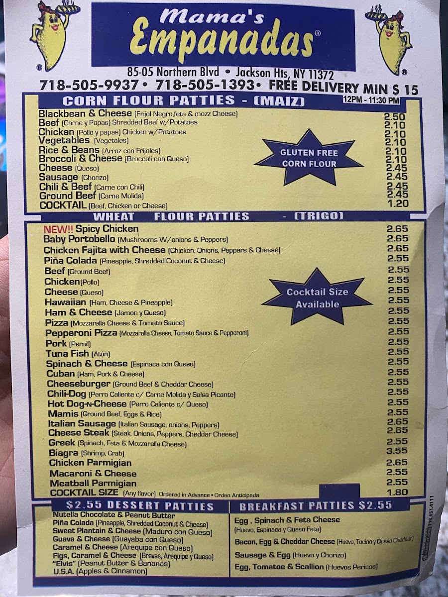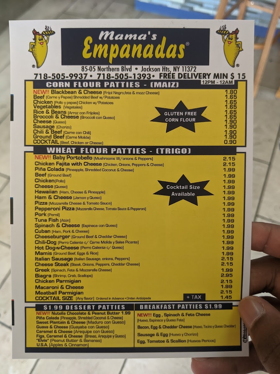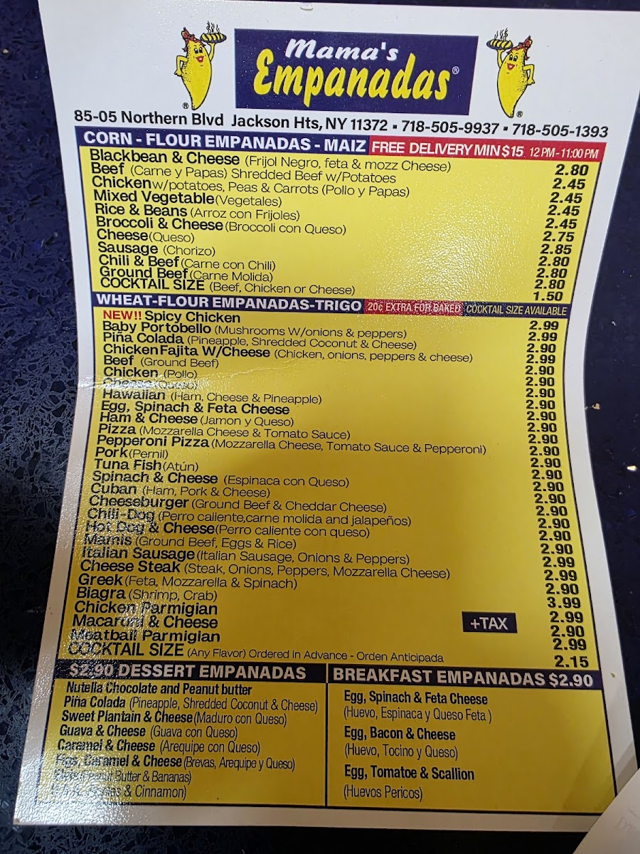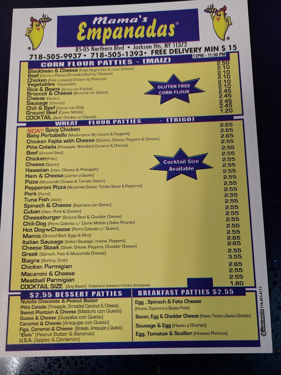 At Mama's Empanadas, you'll find a delightful fusion of flavor-packed Latin American cuisine, all wrapped up in a golden, crispy empanada. Located at 85-05 Northern Blvd in Jackson Heights, NY, the Mama's Empanadas Menu offers a range of options that will satisfy any craving. From savory, seasoned meats to fresh vegetables and mouthwatering cheeses, every empanada is made with care and authenticity. Each bite is a perfect balance of textures, with the crispy outer layer giving way to the rich, flavorful fillings inside. Whether you're in the mood for a classic beef empanada, a cheesy indulgence, or something with a bit of spice, you'll find plenty of choices to tempt your taste buds. The menu also features various sides and refreshing drinks that pair perfectly with your empanada, making it a complete and satisfying meal. With a warm and inviting atmosphere, Mama’s Empanadas is the perfect spot to enjoy a delicious meal on the go or to sit and savor each bite.