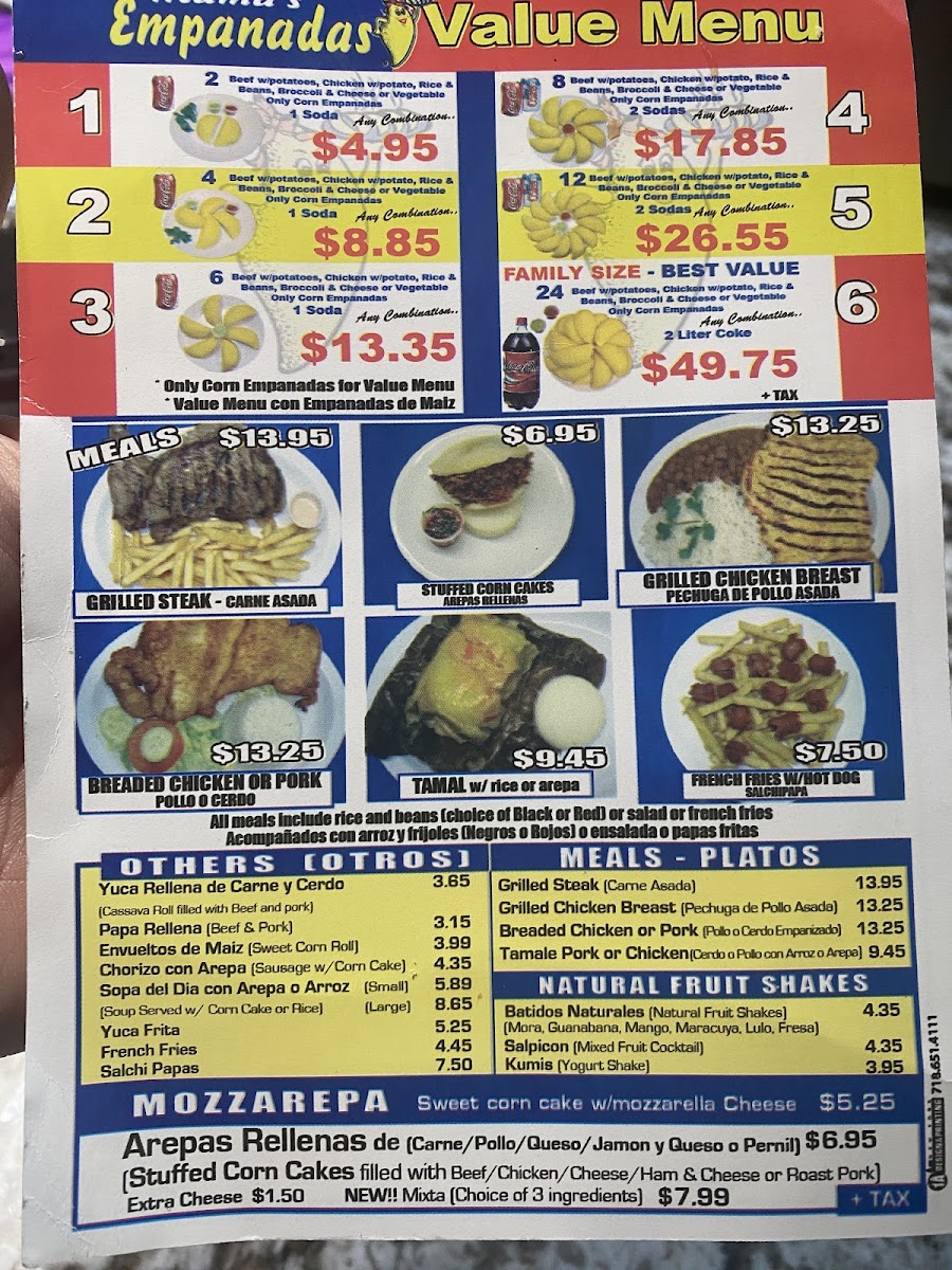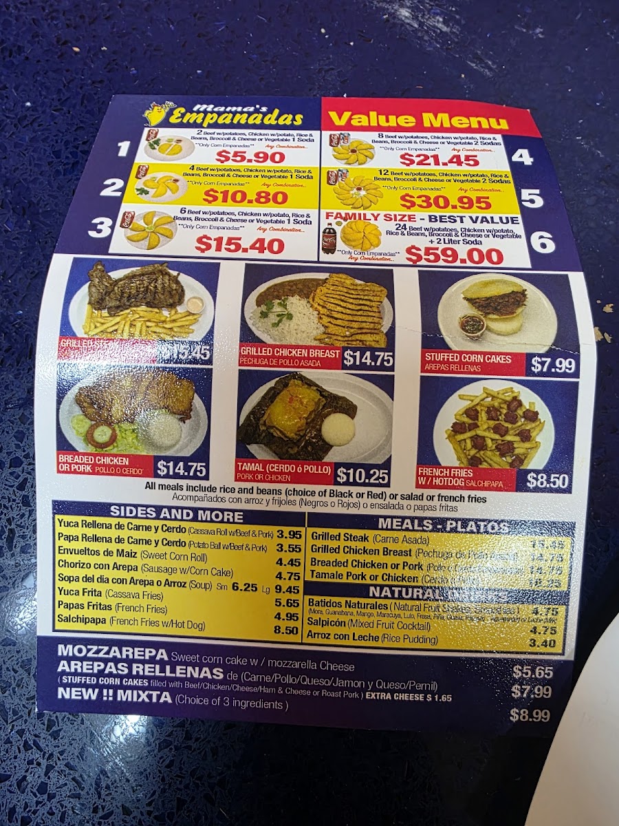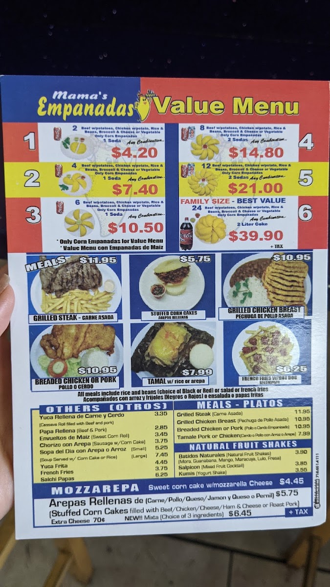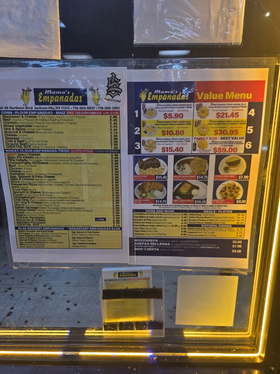 At Mama's Empanadas, you'll find a delightful fusion of flavor-packed Latin American cuisine, all wrapped up in a golden, crispy empanada. Located at 85-05 Northern Blvd in Jackson Heights, NY, the Mama's Empanadas Menu offers a range of options that will satisfy any craving. From savory, seasoned meats to fresh vegetables and mouthwatering cheeses, every empanada is made with care and authenticity. Each bite is a perfect balance of textures, with the crispy outer layer giving way to the rich, flavorful fillings inside. Whether you're in the mood for a classic beef empanada, a cheesy indulgence, or something with a bit of spice, you'll find plenty of choices to tempt your taste buds. The menu also features various sides and refreshing drinks that pair perfectly with your empanada, making it a complete and satisfying meal. With a warm and inviting atmosphere, Mama’s Empanadas is the perfect spot to enjoy a delicious meal on the go or to sit and savor each bite.